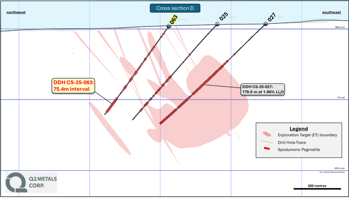 - CS25-027: Widest interval of 179.6 m at 1.66% Li2O, including 58m at 1.75% Li2O; and 91.8 m at 1.81% Li2O.