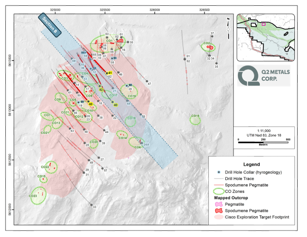 In its inaugural field season, Q2 drilled a total of 6,359.7 m over 17 holes, with every drill hole intercepting spodumene-bearing pegmatite. The campaign was successful in its goals of confirming and expanding upon the mineralization around the CO-1 outcrop, outlining an approximately 1.2 km wide mineralized zone striking approximately 800 m northeast to southwest (subsequently expanded to 1.5km in 2025).